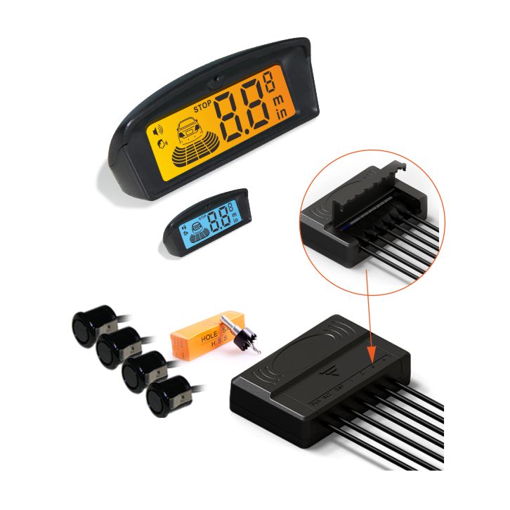 LCD倒車?yán)走_(dá),橙色/藍(lán)色背光臺(tái)式顯示器;內(nèi)置蜂鳴器漸進(jìn)式報(bào)警;40Khz超聲波探頭,探測(cè)距離0.3~1.8M;障礙物不同方位顯示。