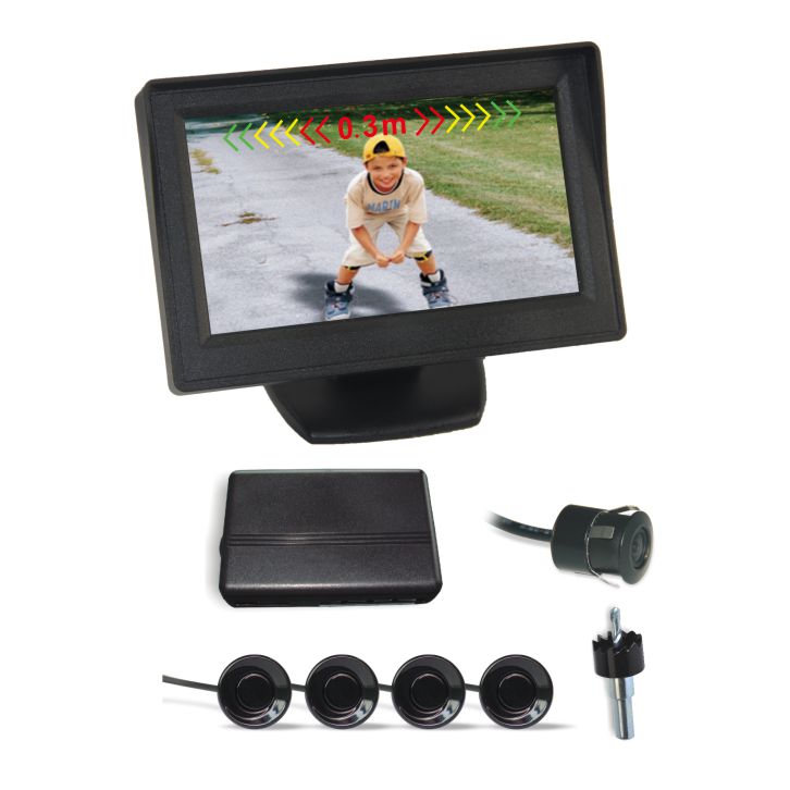 可視倒車?yán)走_,4.3"臺式顯示器;內(nèi)置蜂鳴器漸進式報警;40Khz超聲波探頭,探測距離0.3~1.8M;屏幕上方三色LED光條,分級提醒障礙物距離。